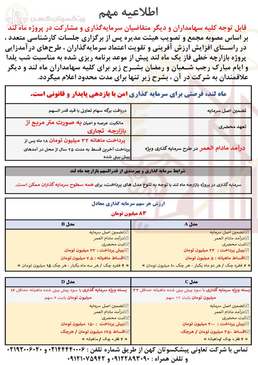 قابل توجه کلیه سهامداران و دیگر متقاضیان سرمایه‌گذاری و مشارکت در پروژه ماه لند